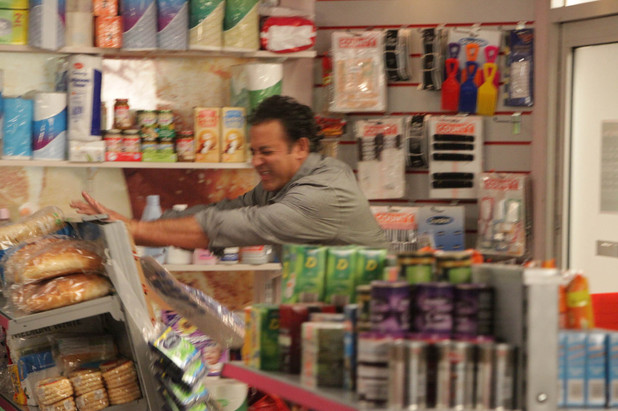 Racked with emotion, Dev (Jimmi Harkishin) turns over his corner shop in a desperate fit of anger.