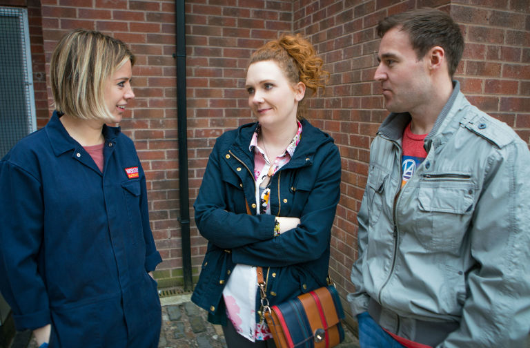 Fiz (Jennie McAlpine) struggles to contain her jealousy when it becomes clear that Tyrone and Abi are getting along very well while working together at the garage.